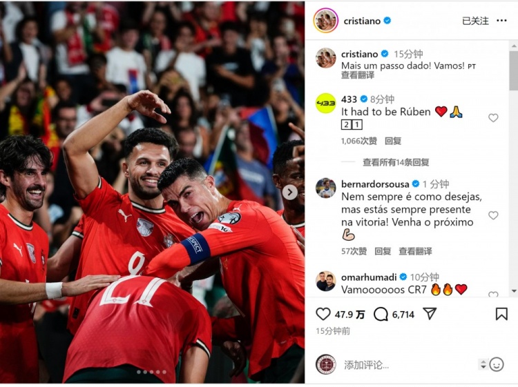 打败爱尔兰!C罗社媒晒照庆祝凯旋:又迈出一步,加油!