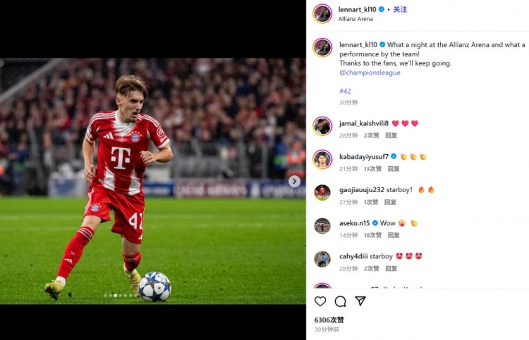 他也在赛后通过社媒晒出我方的比赛照并配文:“在安联球场的精彩整夜,球队的弘扬也太出色了!感谢球迷们,咱们会不竭前进。”