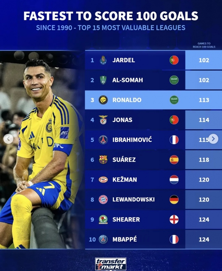 10月26日讯 德国转会市集列出了1990年以来为单支球队攻入100球所需最少场次名次,C罗仅用113场就收尾利雅得得手100球里程碑,名循序三位。