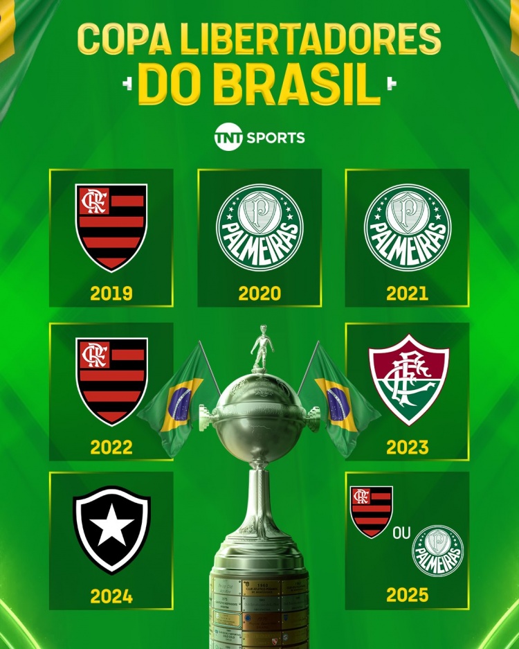 据TNT统计,2019年以来的6届南好意思目田者杯,冠军均为巴西球队。