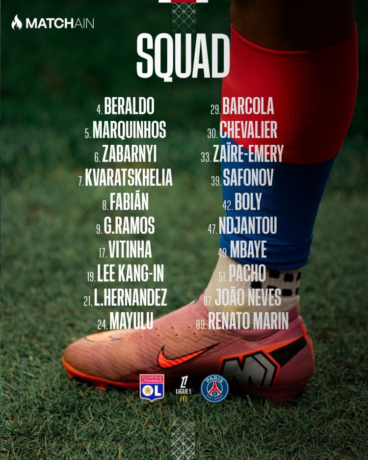 巴黎客战里昂大名单:K77领衔,阿什拉夫、登贝莱、门德斯缺席