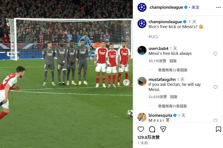 欧冠官方提问谈:赖斯的淘气球依然梅西的? 🤔